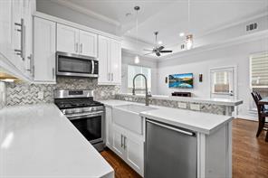 Welcome to this elegant 3 bedroom, 2 full / 2 half bath house in the Heights. This stand alone end unit offers a unique combination of tranquility and space while being walking distance to several popular restaurants and bars. The side yard is great for dogs and the back patio is perfect for grilling and hosting. The open-concept main level features a modern kitchen with a farmhouse sink, hardwood floors, quartz counters, and herringbone backsplash, flowing into a dining area and spacious living room with high ceilings and an abundance of natural light. All three bedrooms are located on the second floor, offering convenience and flexibility for families and guests. The primary suite is privately situated on a separate wing and features dual vanities, a soaking tub, glass shower, and a walk in closet. Enjoy the third-floor bonus room, perfect for a home office, lounge, or game room. No HOA! Plenty of storage! Schedule your private tour today to experience this exceptional property!