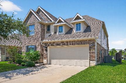 Enjoy serene waterfront living in this beautifully maintained home, ideally situated on a peaceful lake. A charming front porch with stone columns welcomes you inside, where rich wood-like floors flow throughout the main level. The open-concept kitchen features maple cabinetry, granite countertops, a stylish tile backsplash with decorative accents, a breakfast bar, and a cozy breakfast nook with a custom window seat cushion. The kitchen overlooks the spacious family room, complete with a fireplace and elegant granite tile surround. The primary suite is conveniently located on the first floor and boasts a jetted tub, separate shower, and dual vanities. Upstairs, you'll find a large game room, a dedicated media room, and all secondary bedrooms—perfect for entertaining or family living. Additional highlights include a 3-car garage and access to resort-style community amenities through both Canyon Lakes West and Stone Gate.