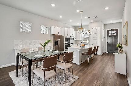 This brand-new contemporary home offers three bedrooms plus a flexible game room, designed for modern living. First-floor living and dining areas feature soaring 12-foot ceilings, real wood flooring, and abundant natural light. Each bedroom includes a private bath, providing comfort and privacy for residents and guests. The open-concept layout connects the kitchen, dining, and living spaces, ideal for everyday living and entertaining. HUGE sliding glass doors open to a fenced yard, extending the living space outdoors. The kitchen is appointed with sleek European-style soft-close cabinetry, under-cabinet lighting, and premium Fisher & Paykel appliances. Upstairs, a centrally located flex space separates the primary suite from secondary bedrooms for added privacy. The spa-inspired primary bath features a freestanding soaking tub, a seated walk-in shower, and Hansgrohe fixtures. Located in the Avondale community, residents enjoy access to a resort-style pool and dog park.